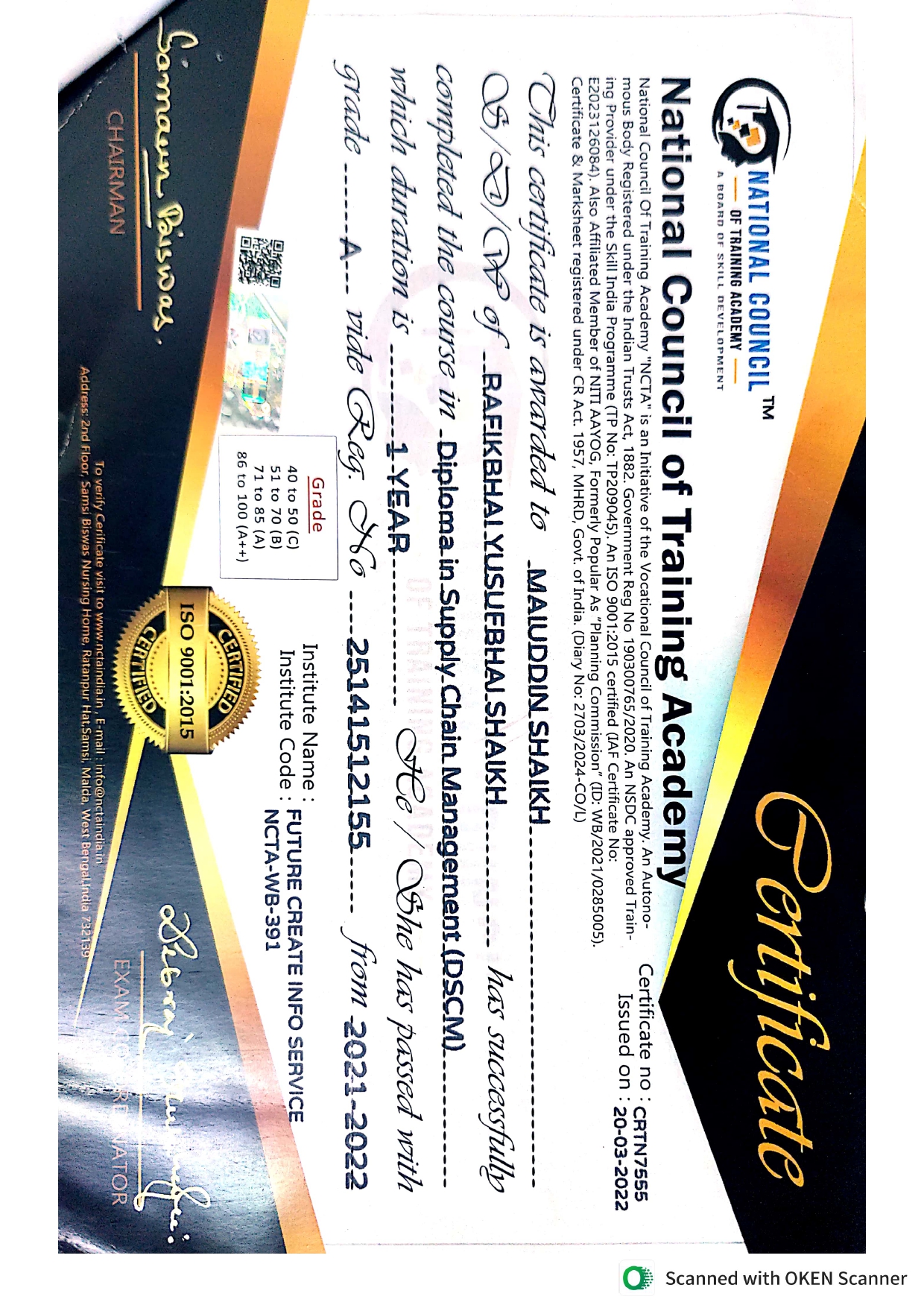 This is an example of a training academy certificate from the National Council of Training Academy.